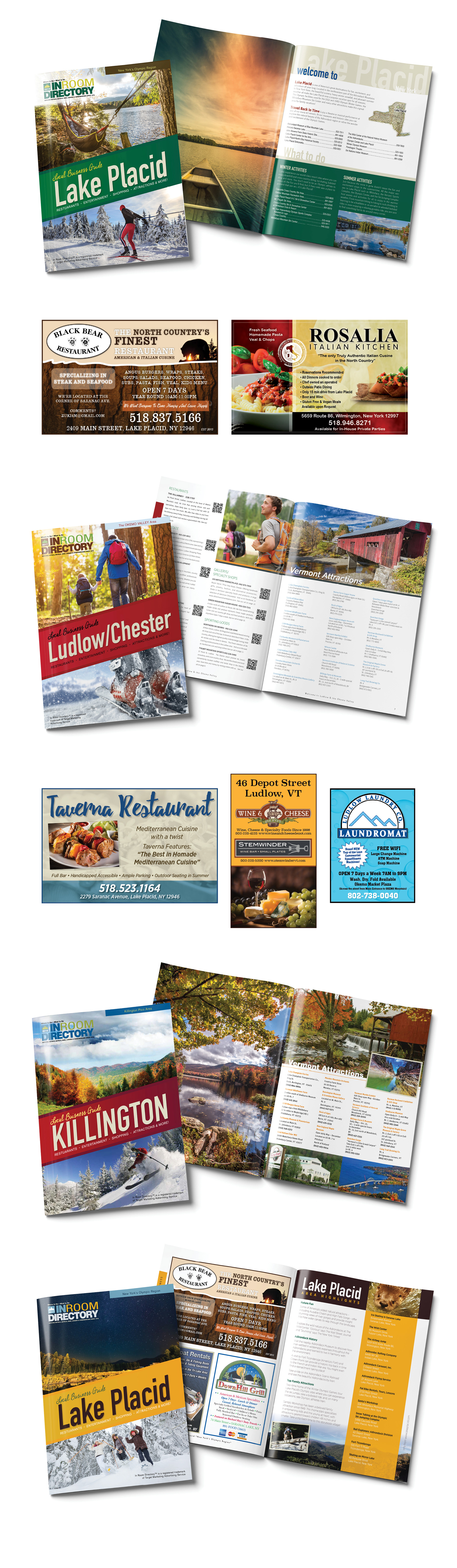 These custom-designed publications were created to support and promote local tourism by highlighting attractions, restaurants, and businesses in destination towns such as Lake Placid, NY. Distributed in hotels, inns, and local establishments, each issue was thoughtfully laid out to provide visitors with engaging, visually appealing, and easy-to-navigate guides. I managed the full design process—from cover concepts and layout design to ad creation and print production—ensuring consistency, quality, and a cohesive brand experience tailored to each region.